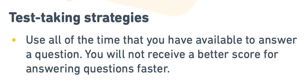 The only exceptions to this are the Interactive Reading and the Interactive Listening sections, where the entire section is timed and you have to answer multiple questions. This means that going fast on some questions will leave you with more time for later questions.