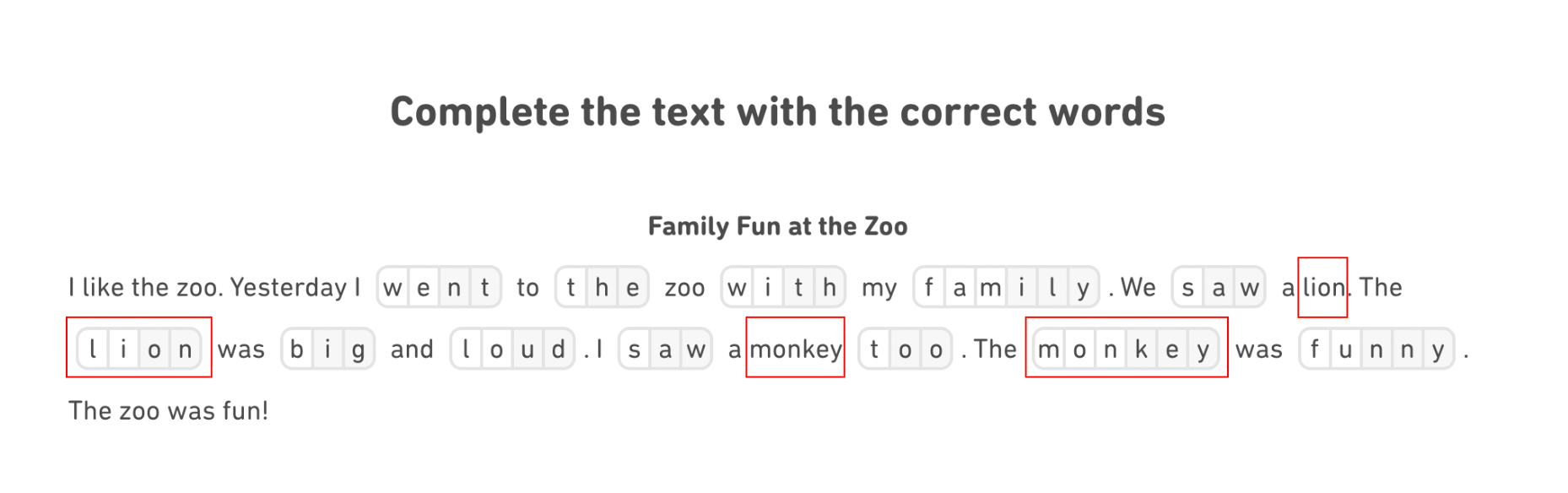 Two of the words you needed to fill in (lion and monkey) appeared as completed words in the passage. In other words, you were practically given 2 answers!