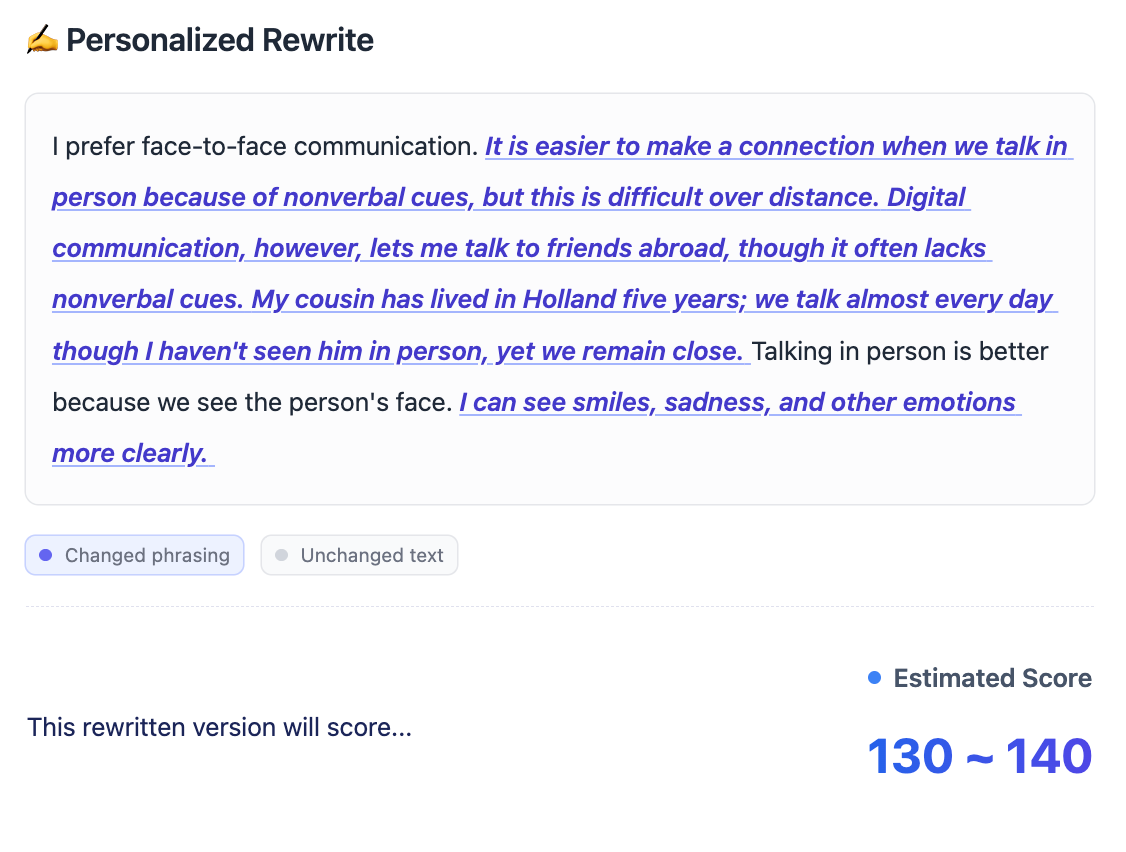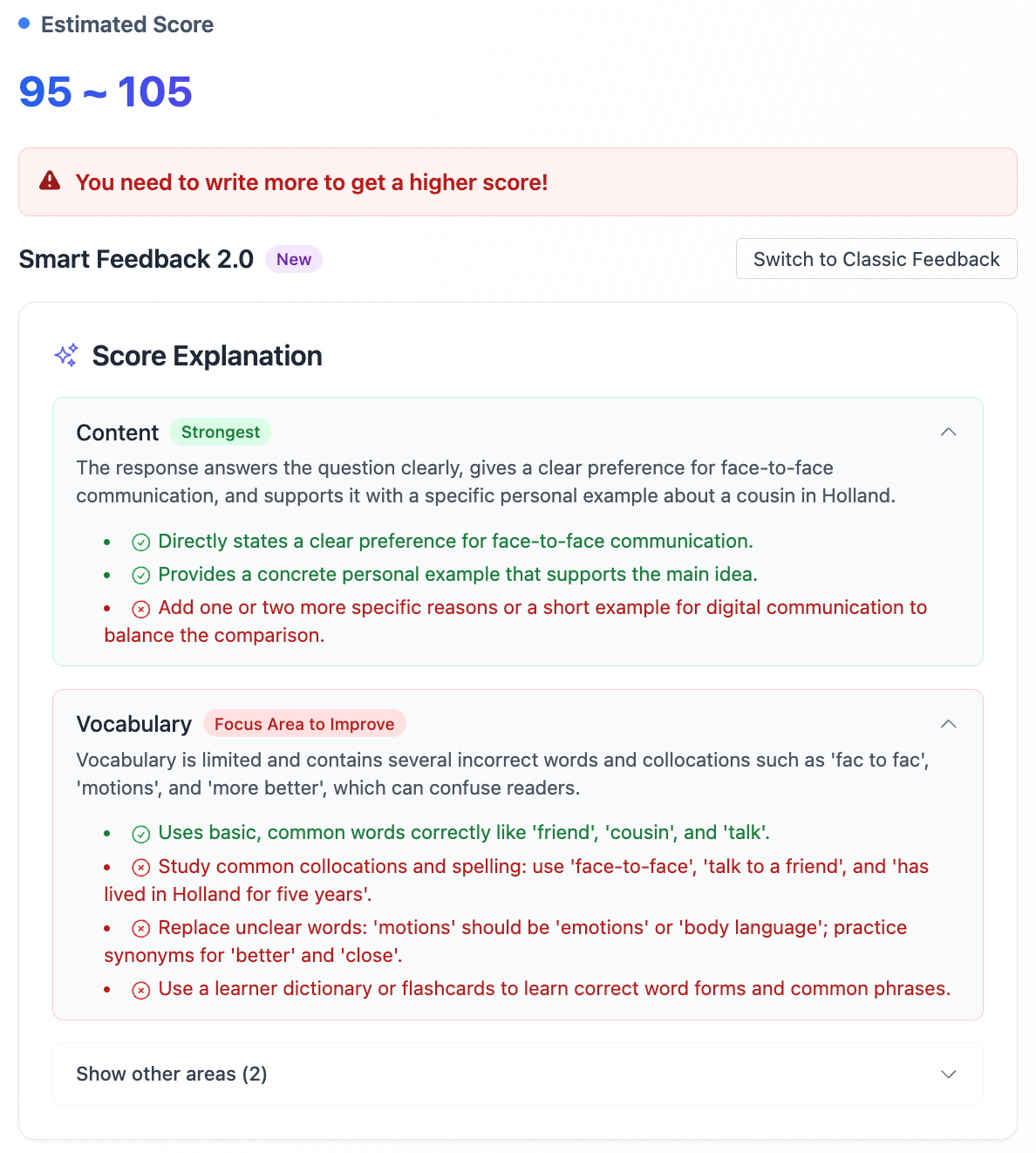 Templates make it easier to know what to write or say in your response. That way, you can focus on your ideas, grammar, and vocabulary and less on how to structure your response.
