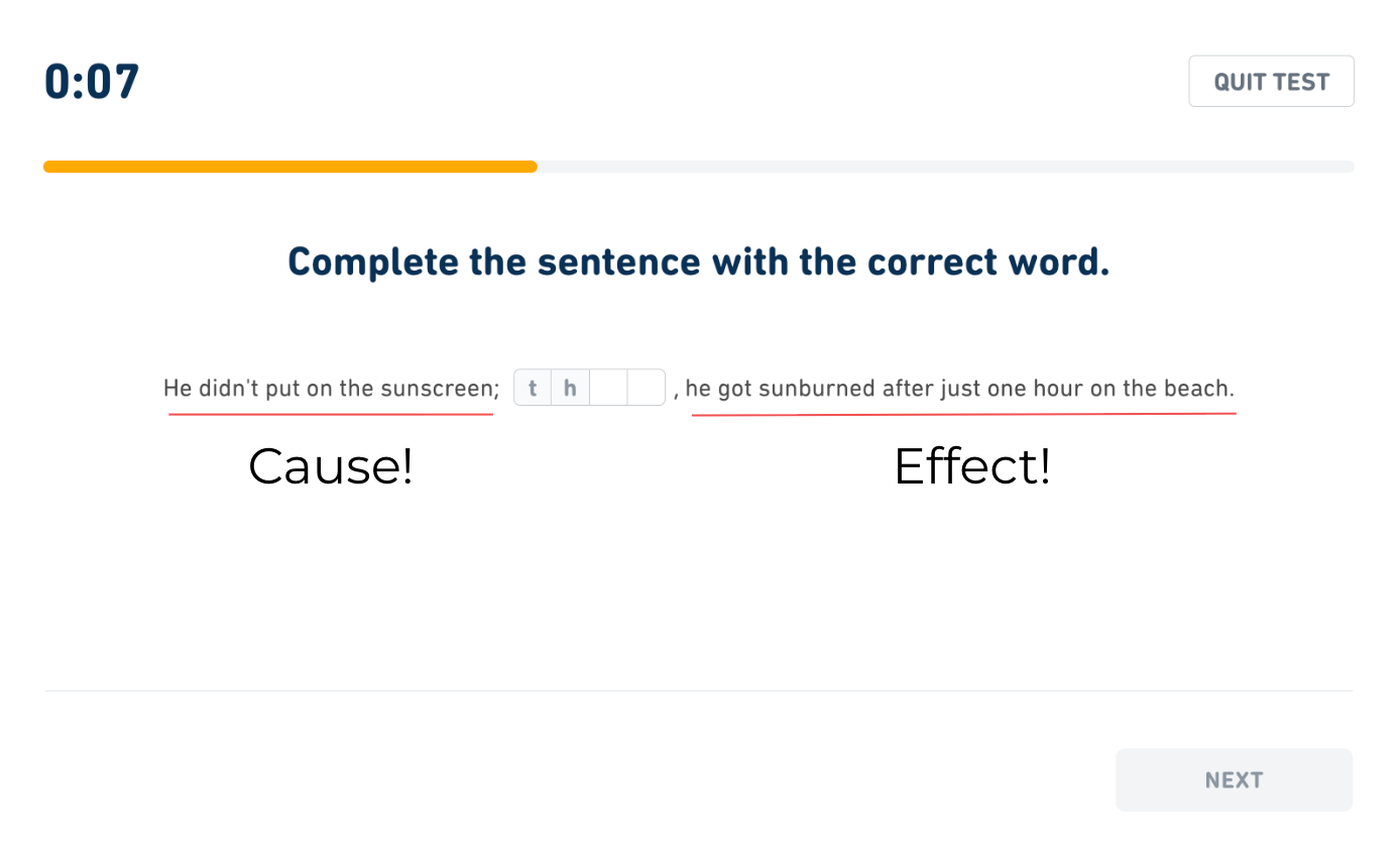 Make sure you entered the letters that you meant to type! This in obvious one, but it's important to remember it because Fill in the Blanks are so fast, so it's easy to start rushing and forget this step. (In general, anytime you write on the DET, save some time to proofread to make sure you don't have any typos or other easy-to-fix mistakes.)