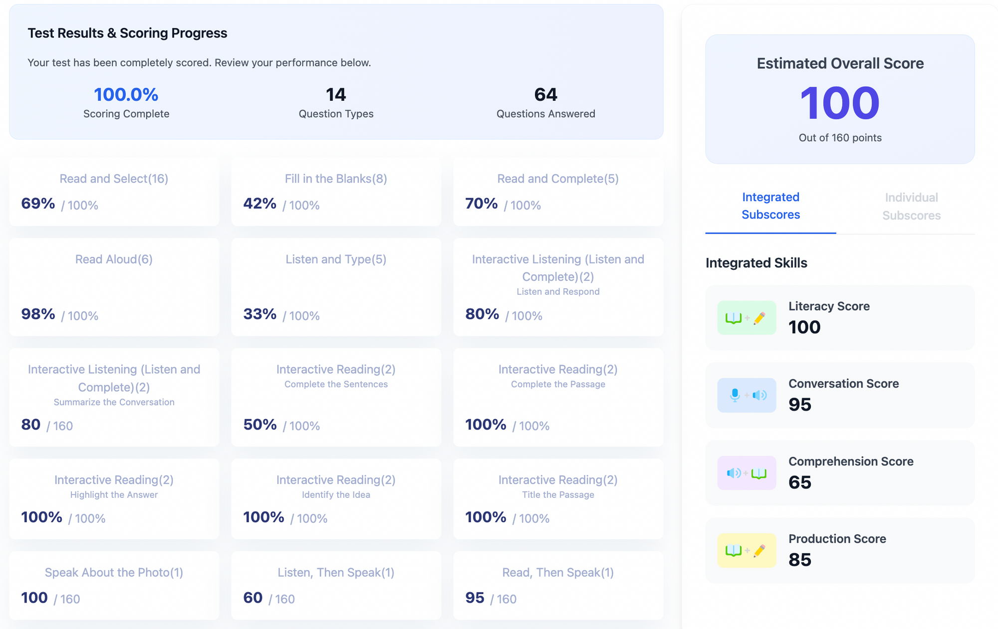 If you have already taken the Duolingo English Test, then you know your scores. To improve, you should focus on your lowest subscores. The lower a score, the faster it can improve. For example, improving from 75 to 85 is easier than improving from 85 to 95.