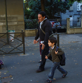 Sentence #1 (General description): This image shows a man and a little boy walking down the sidewalk.
